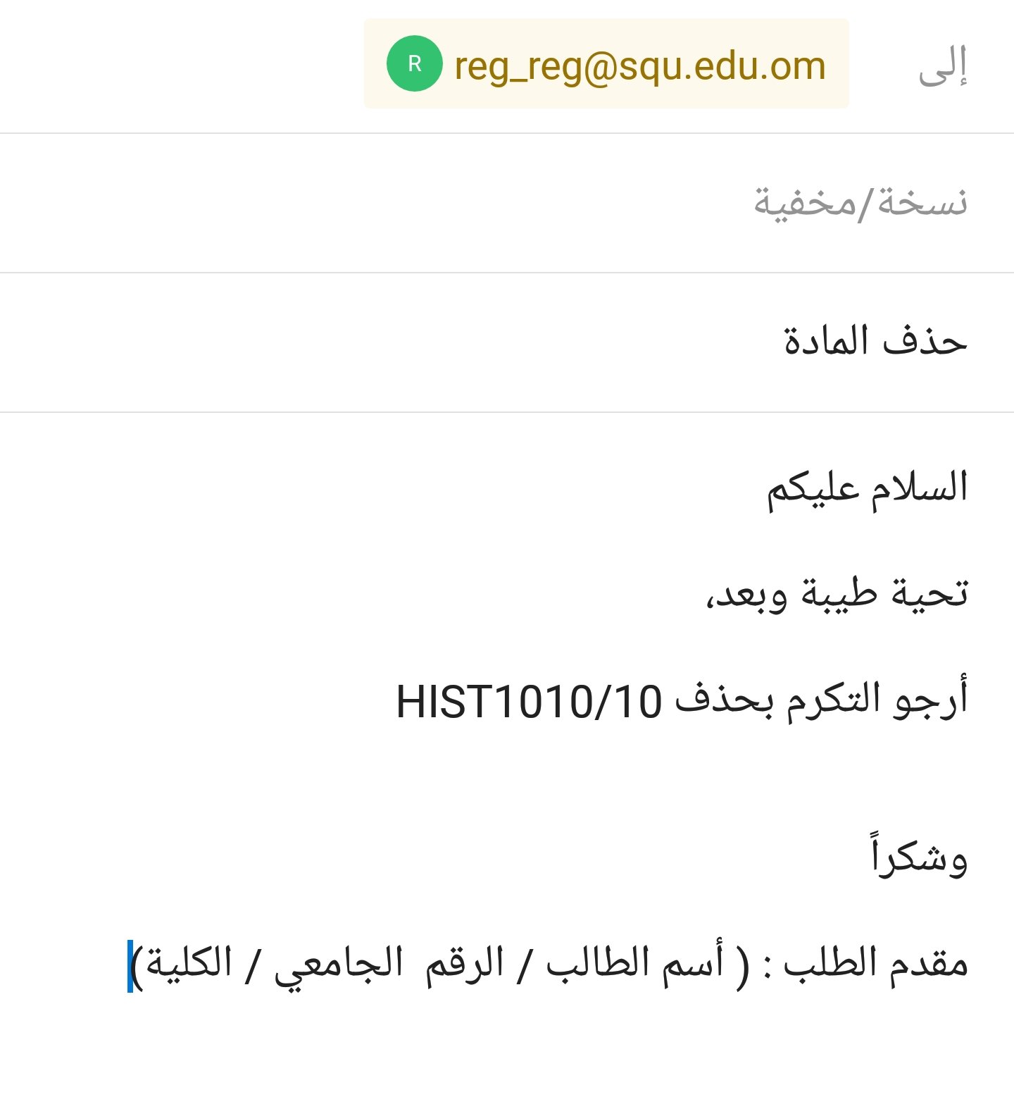 Squ Coffee A Twitter نموذج لحذف المادة السلام عليكم تحية طيبة وبعد أرجو التكرم بحذف رمز المادة مثال Hist1010 10 وشكرا مقدم الطلب أسم الطالب الرقم الجامعي الكلية Https T Co 13dm7xwrxj